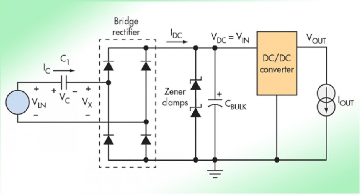 ამ წრიული დიაგრამის როგორც სრულ ტალღურ, ასევე ნახევრადტალღური გამსწორებელი პროგრამების მთავარი იდეაა ის, რომ ხაზის კონდენსატორი C1 მოქმედებს როგორც უდანაკარგო რეზისტორი, ხოლო კონდენსატორის რეაქტიულობა რეგულატორის მსგავსად მოქმედებს, სადაც ის განსაზღვრავს მაქსიმალურ დენს, რომელიც შეიძლება მიეწოდოს DC-DC შეყვანას. ამასთან, ამ შემთხვევაში, რადგან შეყვანის დენი შენელებულია C1– ით, სიმძლავრის ფაქტორი ნულს მიუახლოვდება. ამიტომ, დენის ფაქტორის გაზრდა შესაძლებელია პარალელური რეზისტორის გამოყენებით 500 კმ ომზე. ამ წინააღმდეგობის მნიშვნელობის ზრდასთან ერთად, გათბობის რაოდენობა გაიზრდება და კონტაქტორი იწყებს მუშაობას. ამიტომ, ამ ბალანსს მაქსიმალური ყურადღება უნდა მიექცეს.